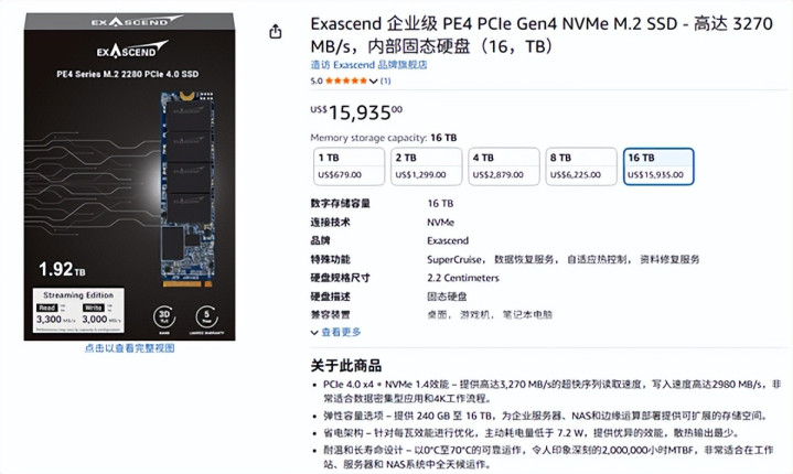 亚马逊上还是有卖的了,标价15935好意思元,约合东说念主民币10.95万元,颠倒于每TB 7100多元。