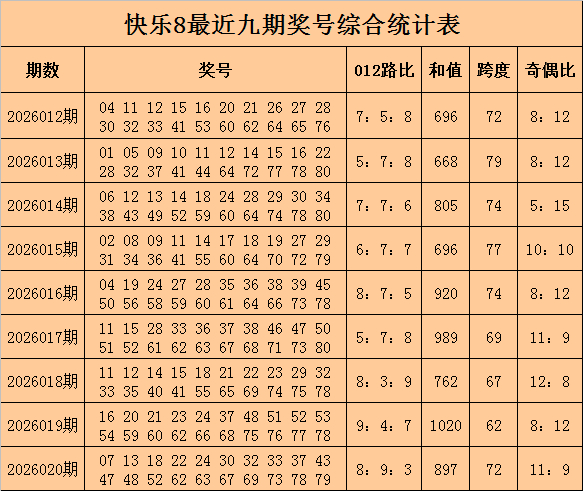 福彩快乐8第2026020期开奖回顾奖号:07 13 18 22 24 30 32 33 37 43 47 48 52 62 63 67 69 73 78 79,其中奖号奇偶比为11:9,012路比为8:9:3,和值为897,跨度为72。
