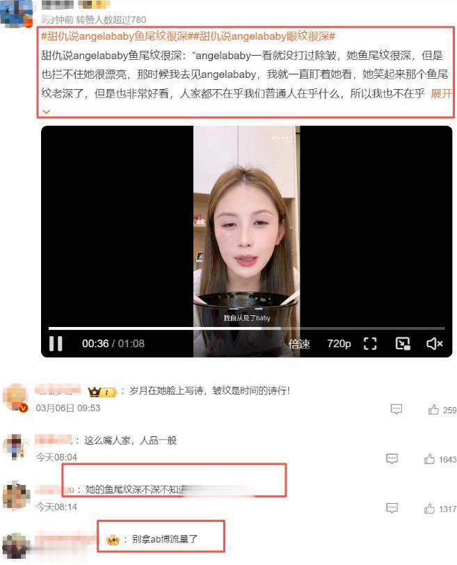 本领线拉回2026年3月,甜仇在直播中以“客不雅评价”为名,暗讽杨颖“鱼尾纹深、国法纹显然”,甚而阴阳怪气地补刀“没打除皱针”。这场直播飞速登上热搜,但甜仇的“谨防念念”被网友一眼看透——借拉踩顶流女星博取流量。