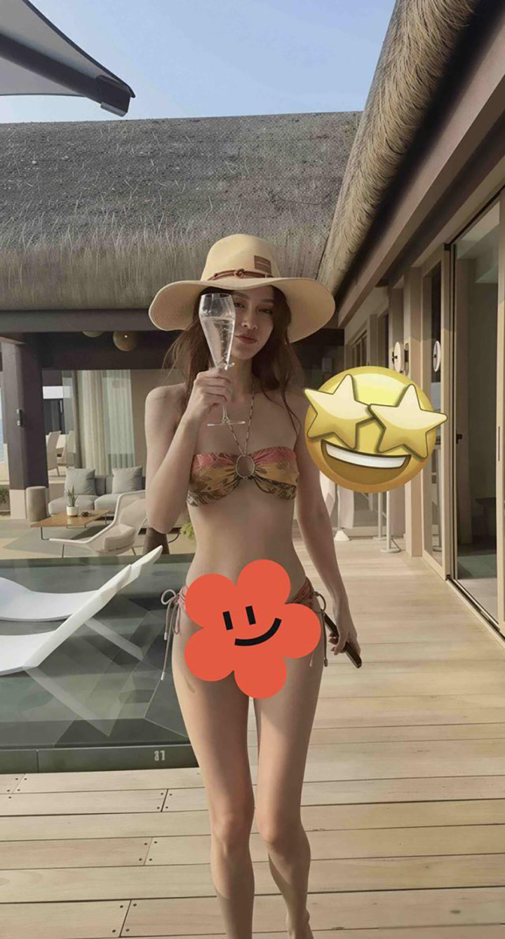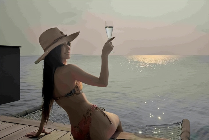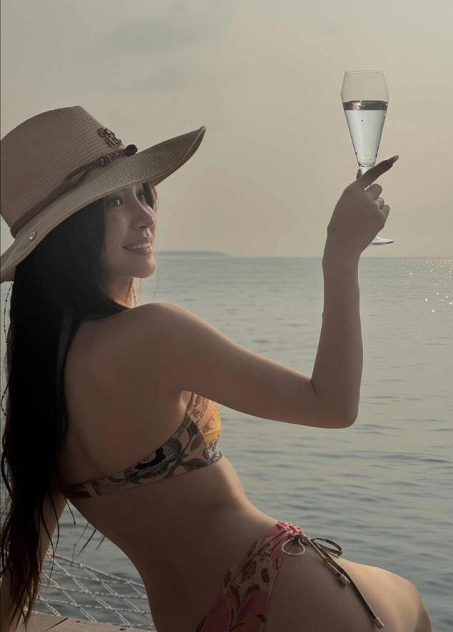 相片中,她身着樱花粉比基尼,头戴宽檐凉帽,手合手香槟杯,在马尔代夫的果冻海中自信溜达,紧致的腰腹线条、优胜的臀腰比与获胜修长的双腿,让网友直呼“这躯壳比例是天主亲手调的吧”。