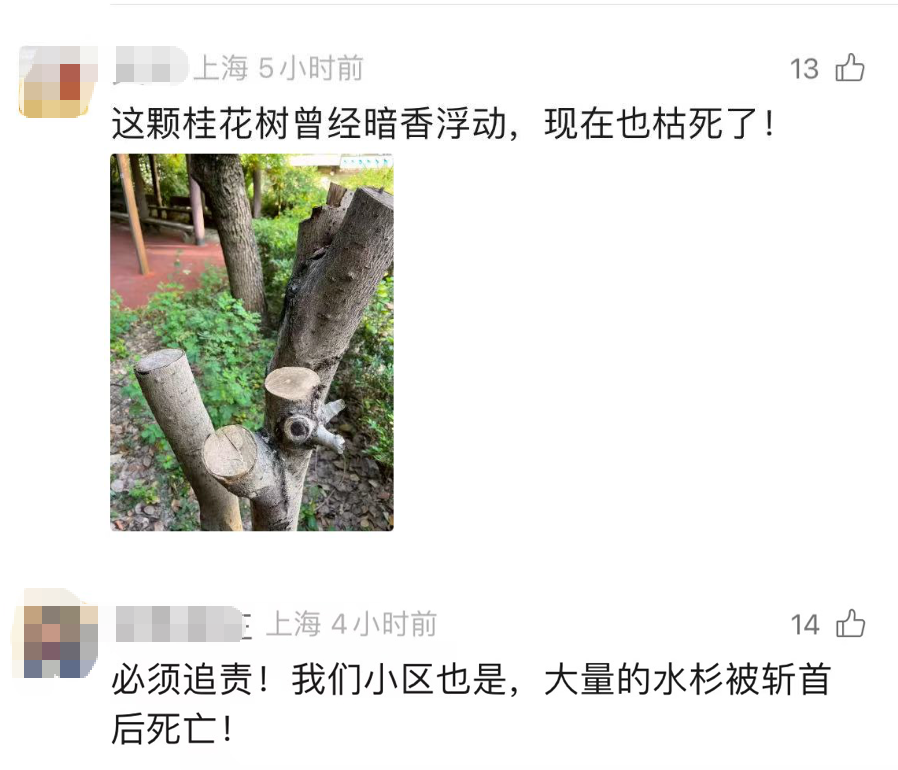 今年五月,小坊曾报道过闵行区金城绿苑小区五棵三十年树龄的雪松,因养护不当死亡的事件,事后,相关责任单位也受到了处罚。然而风波未平,波澜又起。