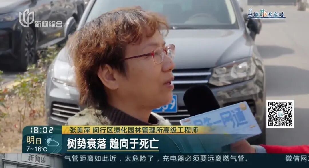 张美萍 闵行区绿化园林管理所高级工程师:树势衰落,趋向于死亡。这些(趋向死亡的)属于过度修剪,属于未按养护技术标准进行养护。