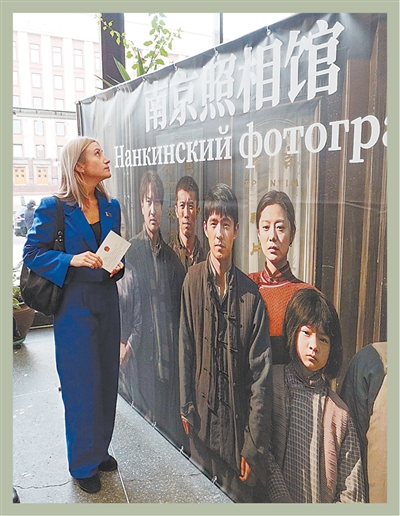 白俄罗斯明斯克,观众在电影《南京照相馆》海报前驻足。任科夫摄