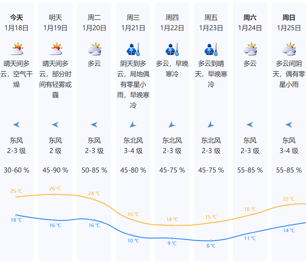 21-23日 受冷空气影响,气温明显下降,最低气温降至8℃左右。