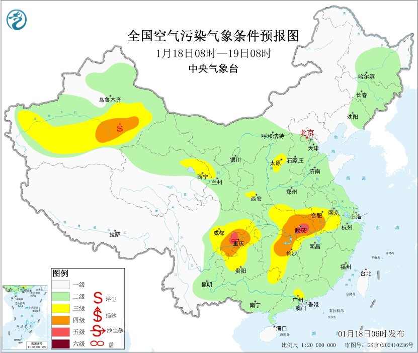 {jz:field.toptypename/}18日白天,四川盆地、江汉、江南中西部等地有轻到中度霾,局地有重度霾。18日早晨至上午,四川东部和南部、江南中西部、华南西部等地有大雾,局地有能见度不足200米的强浓雾。19日,受冷空气和降水影响,上述地区的雾霾天气逐渐减弱或消散。此外,18日,受冷空气大风影响,新疆南部和东部等地有沙尘天气。