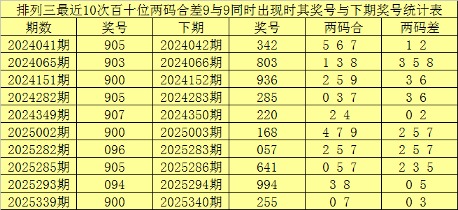 百十位合差分析:上期奖号百十位开出09组合,两码合为9,两码差为9,最近10次百十位两码合9与两码差9同时出现时,其奖号和下期奖号分别为: