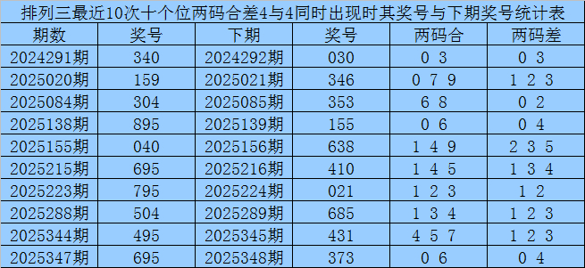 十个位合差分析:上期奖号十个位开出95组合,两码合为4,两码差为4,最近10次十个位两码合4与两码差4同时出现时,其奖号和下期奖号分别为:
