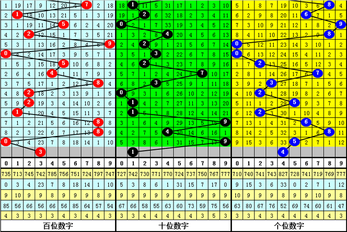 从以上统计可以看出,百十位两码合差9与9同时出现之后其下期两码合差表现最热的4个分别为:2357,本期百十位两码合差可以参考这四码中的数据。