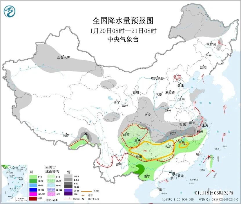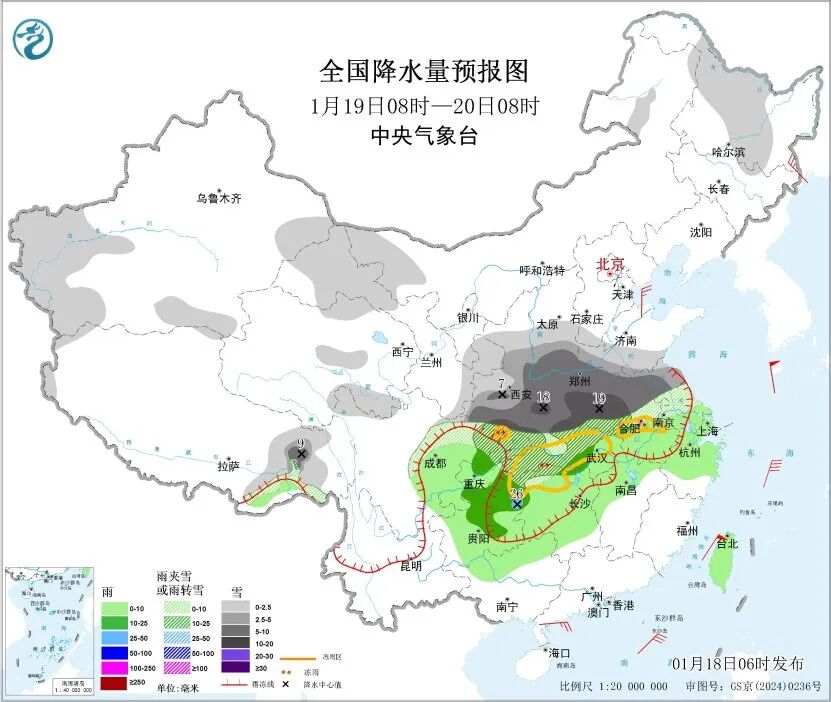 昨天,随着寒潮天气过程开启,大范围雨雪天气开始铺展,华北、黄淮等地出现雨雪天气。今天,雨雪将继续向南大幅扩张;明天起,此轮雨雪进入鼎盛时段。未来四天,中东部地区自北向南将先后出现大范围雨雪天气过程,秦岭-淮河以南地区降水相态复杂,有雨雪及冻雨的转换。