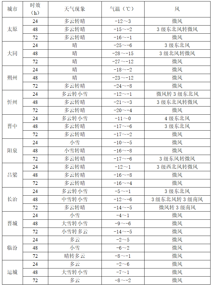 - 天气情况:全省全是阴天,中部部分地区、南部会下小到中雪,南部不少地方直接下大雪,运城、晋城的局部地区还会有暴雪(雪可能埋脚脖子!);