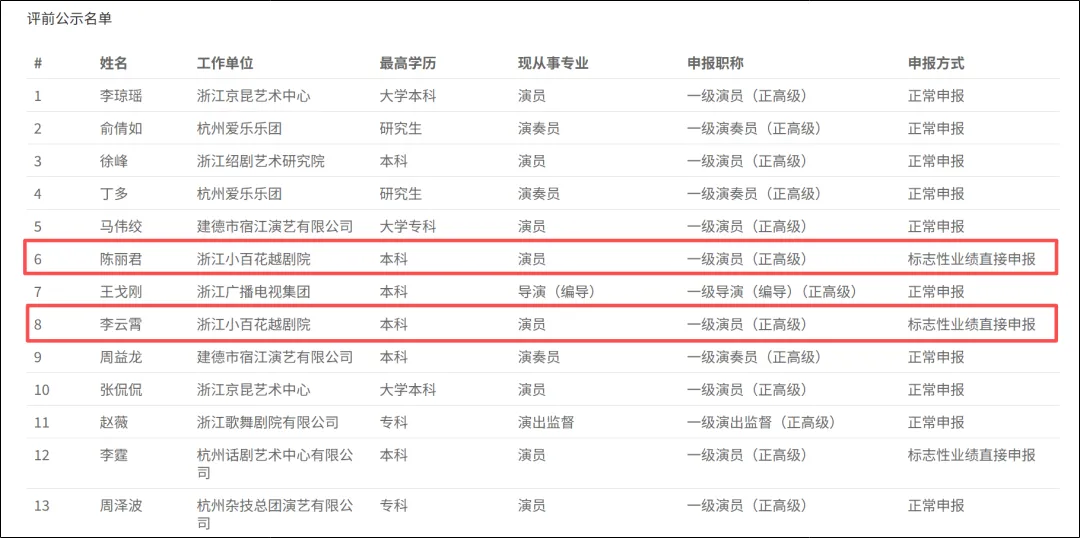 据此前报道,浙江省人社厅网站于2025年12月1日发布《2025年度浙江省文化广电和旅游厅艺术系列高级(艺术一级)专业技术职务任职资格评审计划评前公示》,其中,浙江小百花越剧院演员陈丽君、李云霄以标志性业绩直接申报一级演员(正高级)。