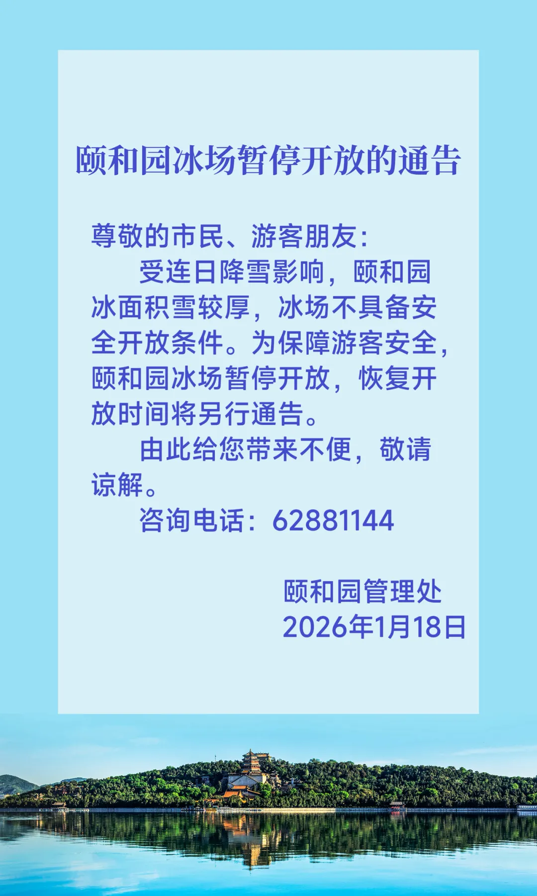 2026年1月18日,颐和园管理处发布冰场暂停开放的通告: