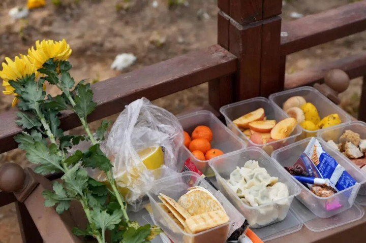 供桌上,一盒煮熟的水饺传递着绵绵思念。新华网杨涵摄