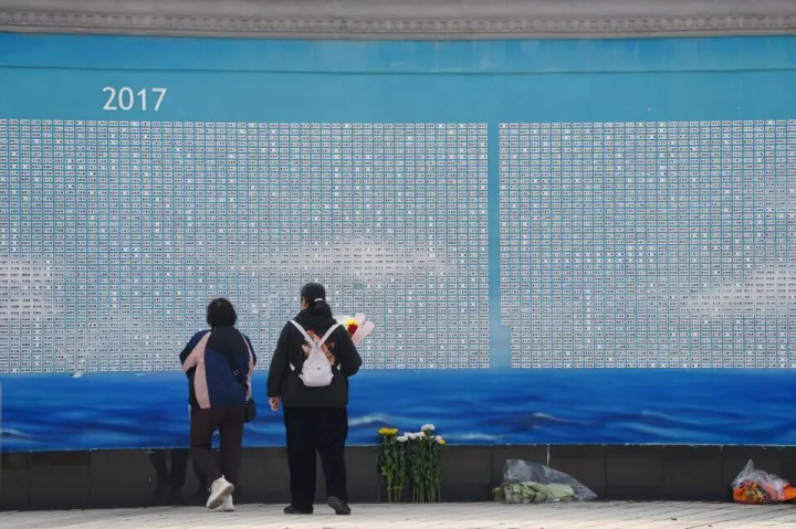海葬缅想墙前的祭奠者。新华网杨涵摄
