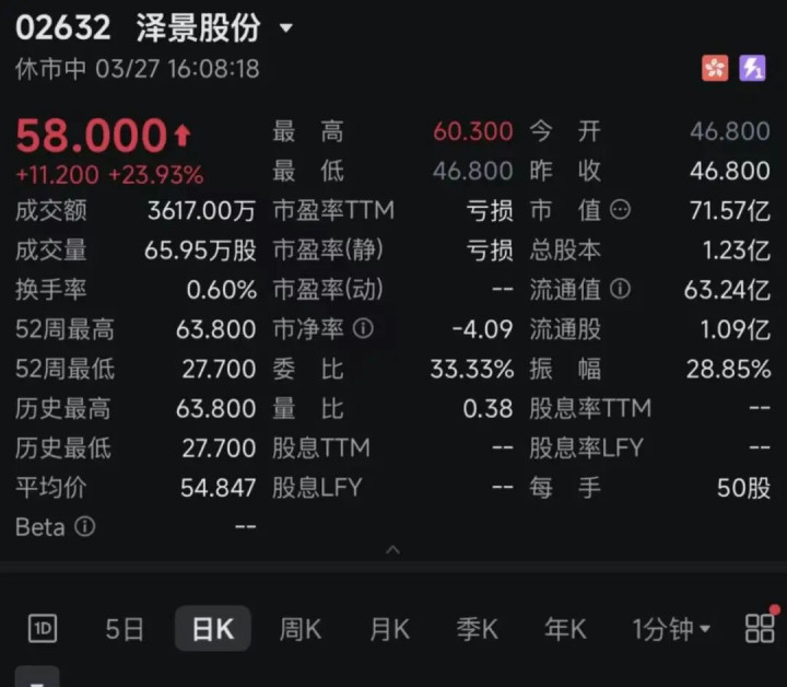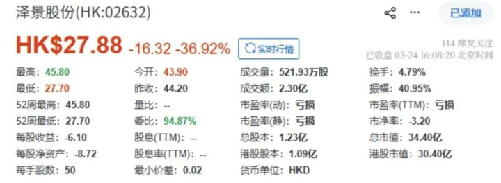 初登港股商场的泽景履历了过山车式、惊魂动魄的两天,开盘43.90港元,上市首日即惨淡破发,收盘27.88港元,跌幅为36.92%。
