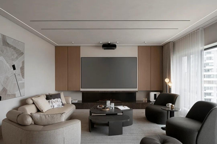 The designer chose laser tv with international famous audio-visual equipment, which gave it more complete functionality. Under the TV wall is a warm bonfire, which shows the warmth of home from the details.