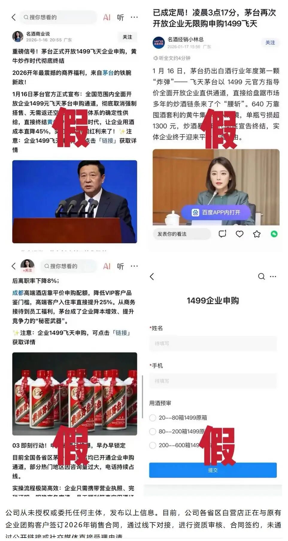 贵州茅台在提示中称,近期,线上平台再次出现冒用茅台名义,发布“开放企业直供通道”“企业1499飞天申购,点击链接获取详情”“飞天茅台官方申请入口”“无需搭售、点击链接立即申请”“1499元企业申购通道”等虚假招商信息,有关内容均属不实宣传,存在误导消费者、甚至诈骗风险。