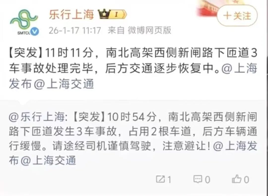 网友的行车记录仪画面显示,当时一辆沿南北高架西侧新闸路下匝道中间车道行驶的银色SUV向左变道,左侧车道上的黑色SUV突然加速,撞上银色SUV。撞击发生前,黑色SUV刹车灯并未亮起。银色SUV被撞后,向右打偏,又撞上右侧另一辆正常行驶的SUV,随后侧翻。