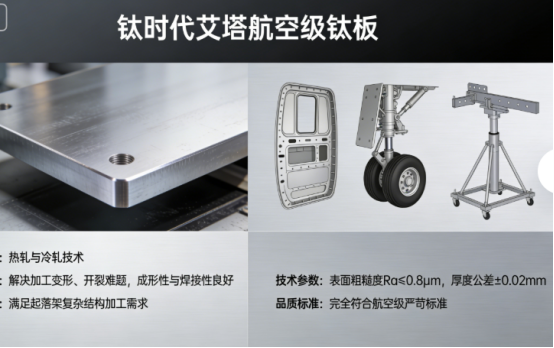 钛期间艾塔出产的航空级钛板,罗致先进的热轧与冷轧工艺,灵验措置了钛板在加工中易变形、开裂的难熬,具备精致的成形性和焊合性,大致满足起落架复杂结构的加工需求,可加工成起落架舱门、支架等各样部件,其名义鄙俗度Ra≤0.8μm,厚度公役法例在±0.02mm以内,全齐安妥航空级严苛花样。