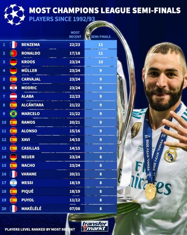 开云app 欧冠改制后进入半决赛次数榜: C罗、本泽马11次最多, 克罗斯10次