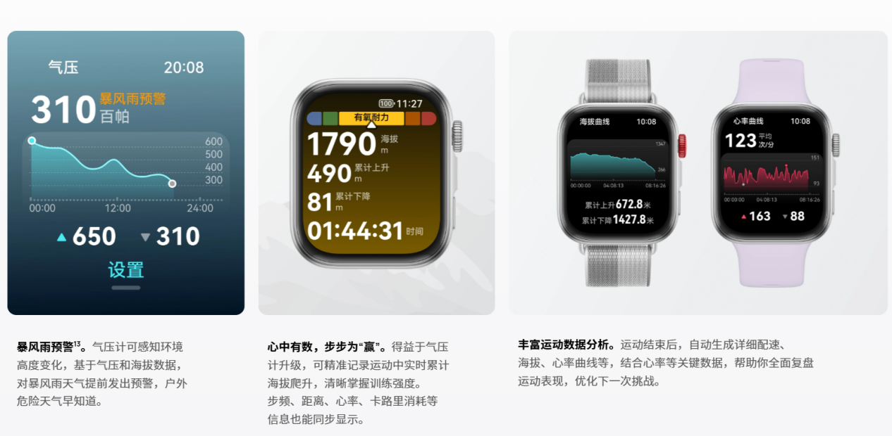 超长续航+专业运动是核心亮点:搭载华为首创高硅叠片异形电池,Pro款轻度使用21天不用充电,重度使用(每天运动1小时)15天仍剩30%电量,彻底告别充电焦虑。业界首发模拟功率功能、FTP以及首发模拟踏频,构建三位一体专业体系专业骑行体系实测精准,自动识别骑行状态,记录坡度、功率等数据,AI解读给出进阶建议,普通爱好者也能获得专业指导。