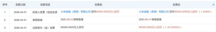 4月1日,天眼查显现,上海小米融资租借有限公司发生注册老本变更,由6亿元增至8亿元,增幅达33.33%。